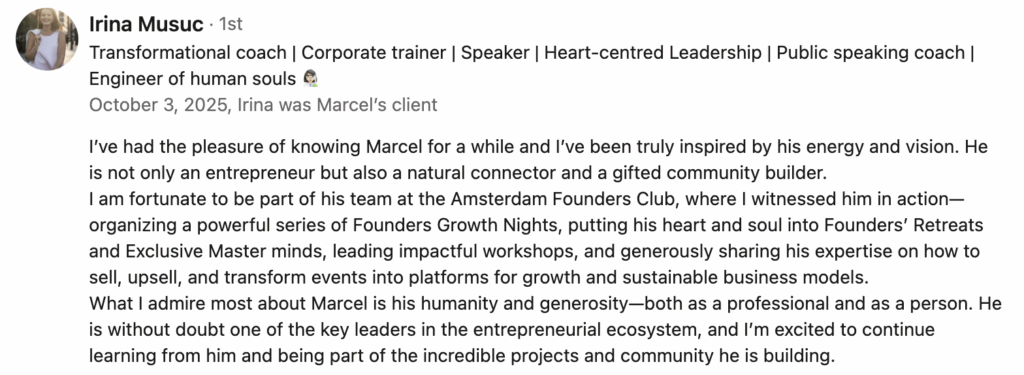 and even built Amsterdam’s most popular founders event series in under 14 months, with 100+ founders paying to be in the room every month.